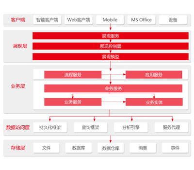 NC6产品的技术架构采用分层体系结构,自下而上包括了存储层、数据访问层、业务层、展现层和客户端。