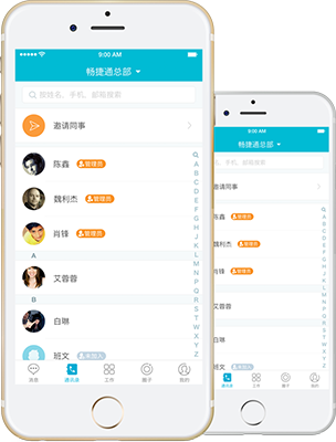 按部门组织列示的同事名录,找部门、搜同事、打电话、发邮件,当然,还有群聊。