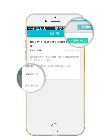 按部门范围发送公告,会推送到部门内全体同事,并且可查看每个同事是否已读。