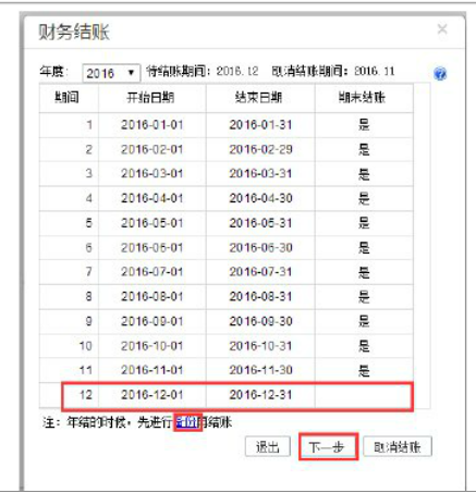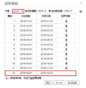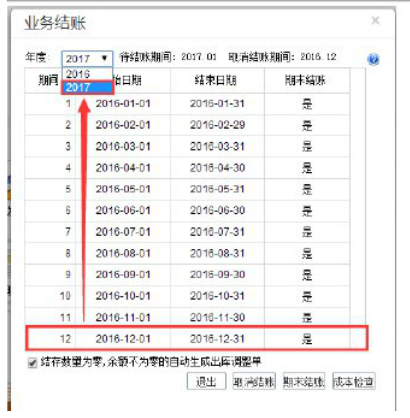(1)2016年12月业务模块结账,“系统管理”-“期末处理”-“业务结账”,当业务12月结完账时,会自动生成17年的会计期间。