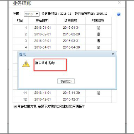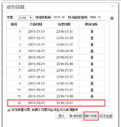 a2、根据自己的需求决定是否选择勾上:结存数量为零,余额不为零的自动生成出库调整单选项,如勾上则有结存数量为零,余额不为零的,在期末处理时会自动生成出库调整单;如不勾则不生成。单击“期末结账”。
