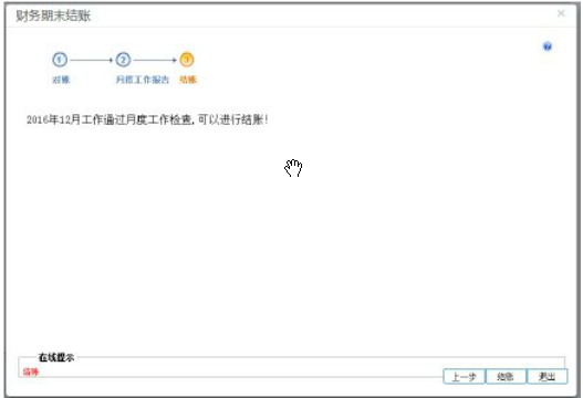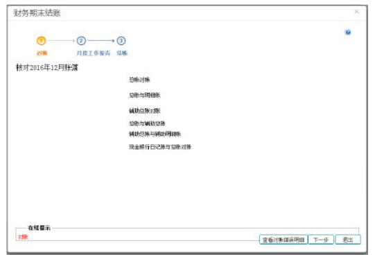 a5、系统自动进行对账,对账成功后点击“下一步”,系统会通过工作检查的提示信息,点击“结账”按钮就完成了任务模块的结账了,如下图所示: