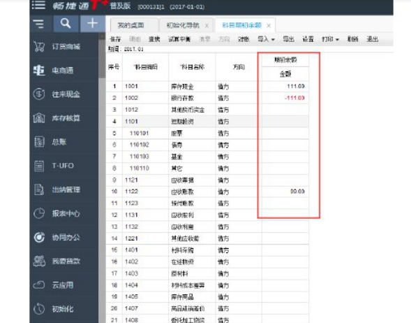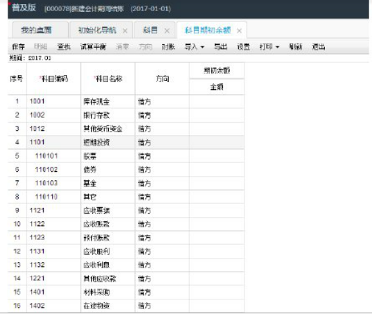 (3)用新年度2017年的日期登入软件,查看科目期初,此时科目期初为上年度的期末余额