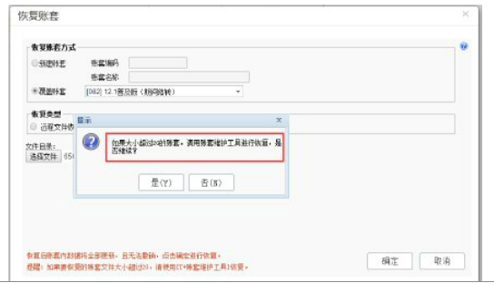 c2、系统会提示超过2G的账套,请使用账套维护工具进行恢复,直接点击确定跳过即可,等待账套是否能够成功恢复,如下图所示: