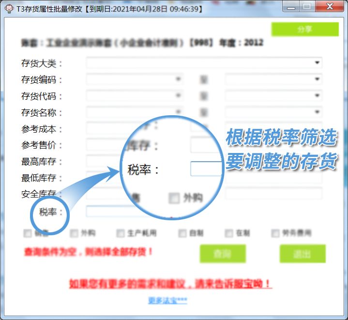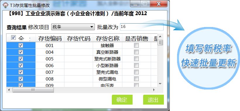 服宝有话说:由于T3中暂时不支持存货属性的批量修改,当企业的存货种类较多,数量庞大时,修改税率也许要花好几天时间。不妨试一试【服宝福袋】中的“T3存货属性批量修改”小应用,该应用专为解决存货大批量修改的问题,哪怕是上万个存货,几分钟就改好了。点我了解更多细节 & 快捷购买通道<<