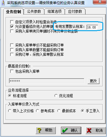 2. 修改采购发票税率。在【采购 -- 采购业务范围设置 -- 业务控制】页签下修改“专用发票默认税率”;