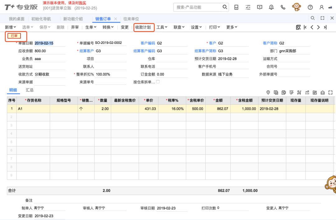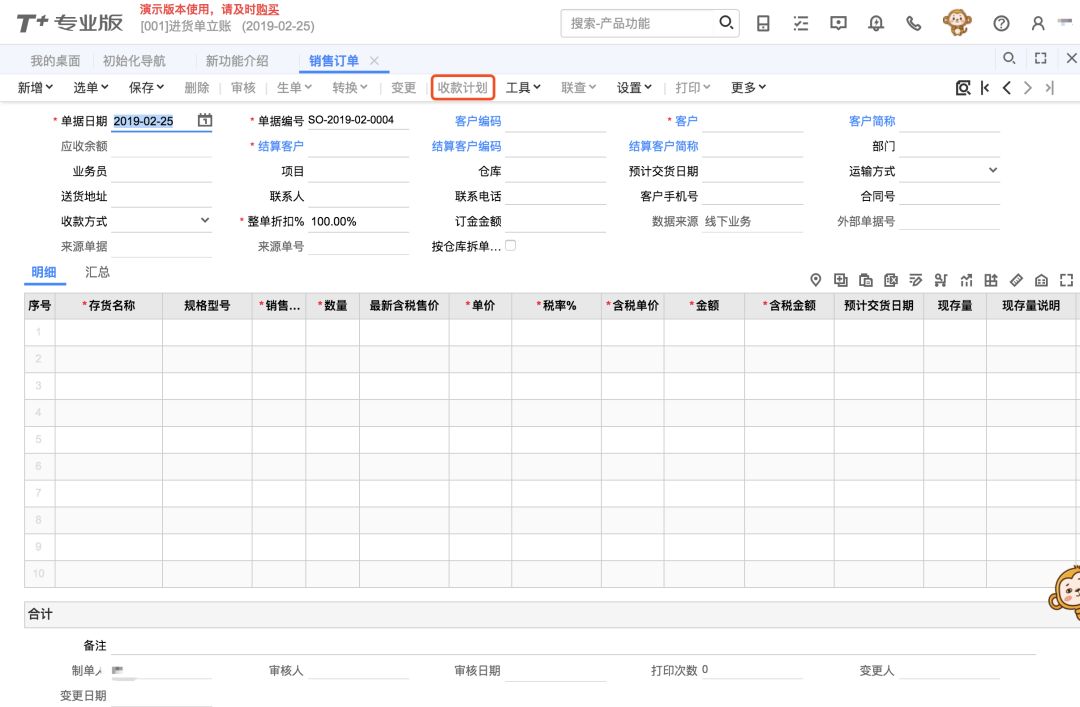 1.销售订单生效时才可以编辑收款计划,即:有审流程时单据审核完毕,无审流程时单据保存;
