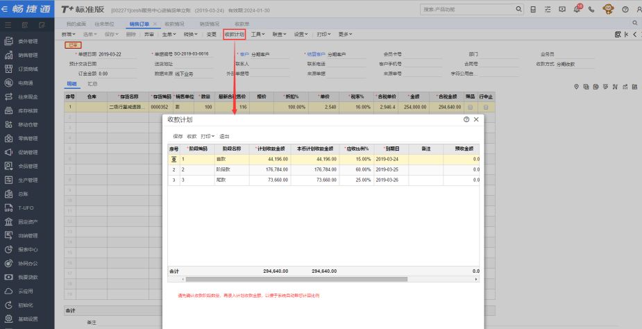 3.保存后的收款计划仅在销售订单变更时可以修改。