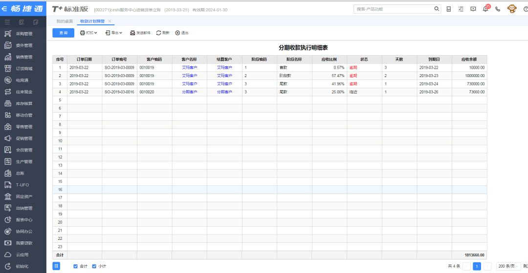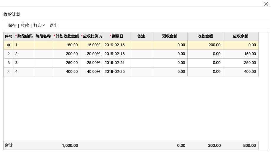 销售订单中增加收款计划,确定收款分几期、到期日、已收款项、应收余额等。