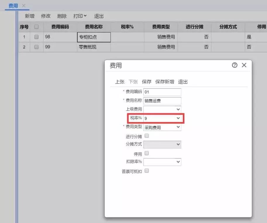 修改费用中的税率。例如,企业所支付或垫付产生的费用,比如说采购运费、代垫的销售运费,将税率从10%改为9%;