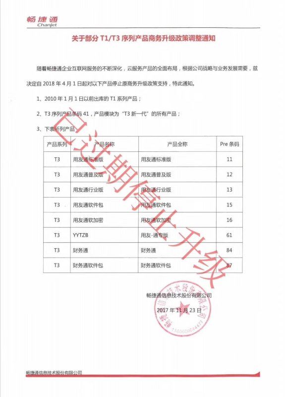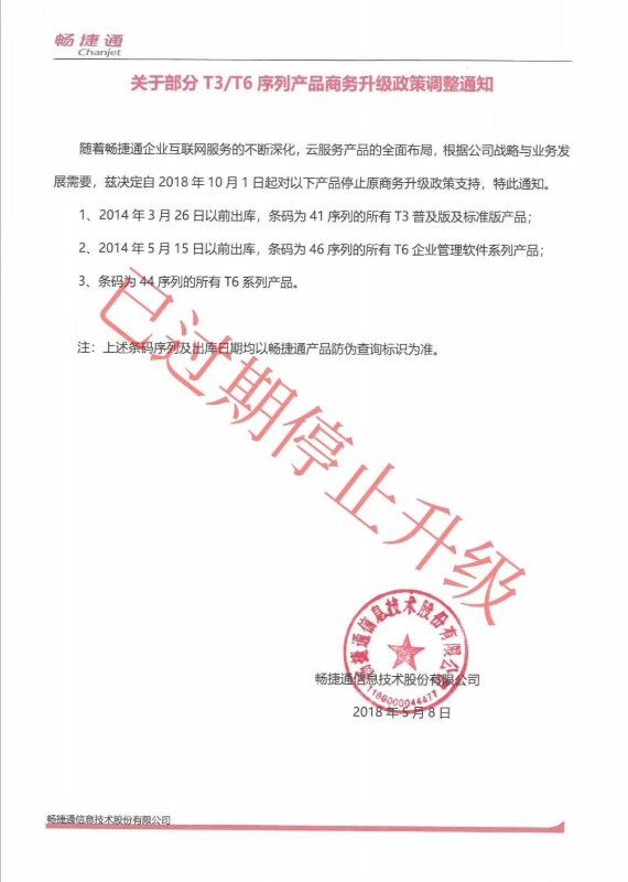随着互联网以及智能应用的普及,畅捷通为了惠及老客户,凡符合调整范围内的产品,均可优惠升级到新版本、加购、拆并卡等,具体优惠幅度请咨询当地软件经销商,同时加密设备调整或涉及拆并情况在优惠截止后,将受影响并恢复原价。