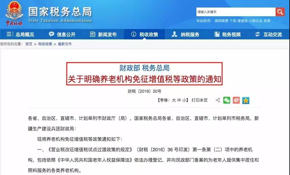 政策依据:《关于明确养老机构免征增值税等政策的通知》(财税〔2019〕20号)