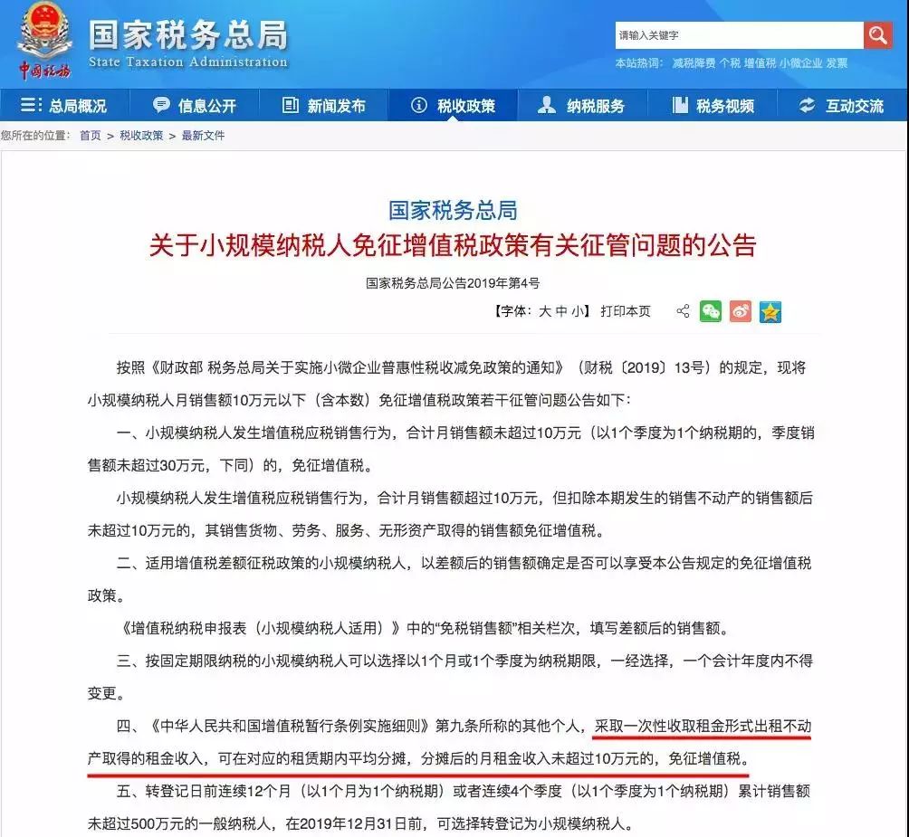 《关于小规模纳税人免征增值税政策有关征管问题的公告》(国家税务总局公告2019年第4号)