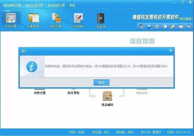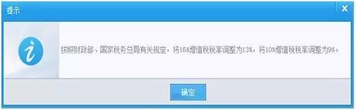2019年4月1日,启用税率调整,老用户更新编码时有提示“按照财政部、国家税务总局有关规定,将16%增值税税率调整为13%,将10%增值税税率调整为9%”,(此提示只显示一次);新用户不显示相关提示。