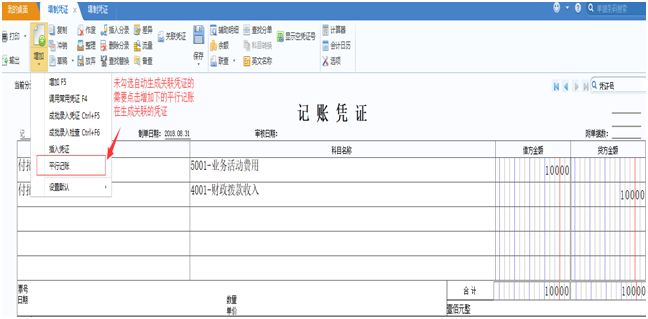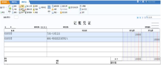 与日常填制凭证一样,进入填制凭证界面,如为平行记账规则的凭证,通过平行记账功能+指定科目+科目对照设置,来实现填制财务分录自动生成对应预算分录的双分录或双凭证的核算模式。在具体操作过程中,单凭证和双凭证模式状态,略有差异,主要为: